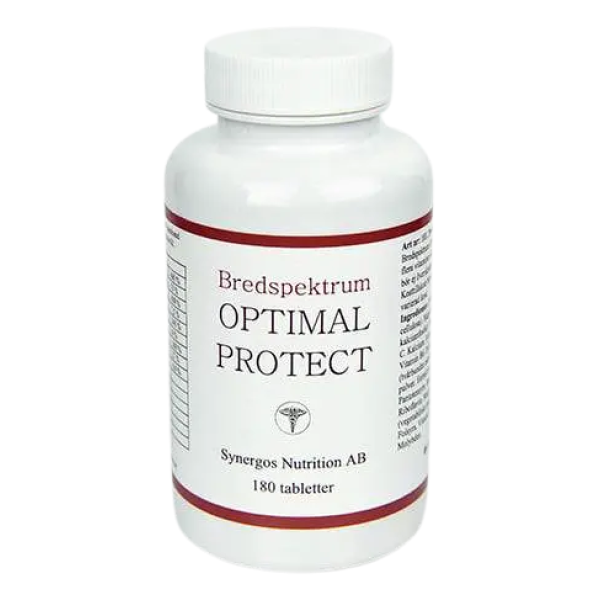 Produktinformation Bredspektrum Optimal Protect Synergos är ett kosttillskott som bygger på bredspektrumprincipen. Denna princip innebär tillförsel av näringsämnen i ett brett spektrum av optimala doser. Preparatet är utvecklat av överläkaren Per-Arne Öckerman, som är professor i klinisk kemi. Varje förpackning innehåller 180 tabletter.Detta är ett dokumenterad medel där en ordinär dos på 4 tabletter per dag ger upptagbar mängd.